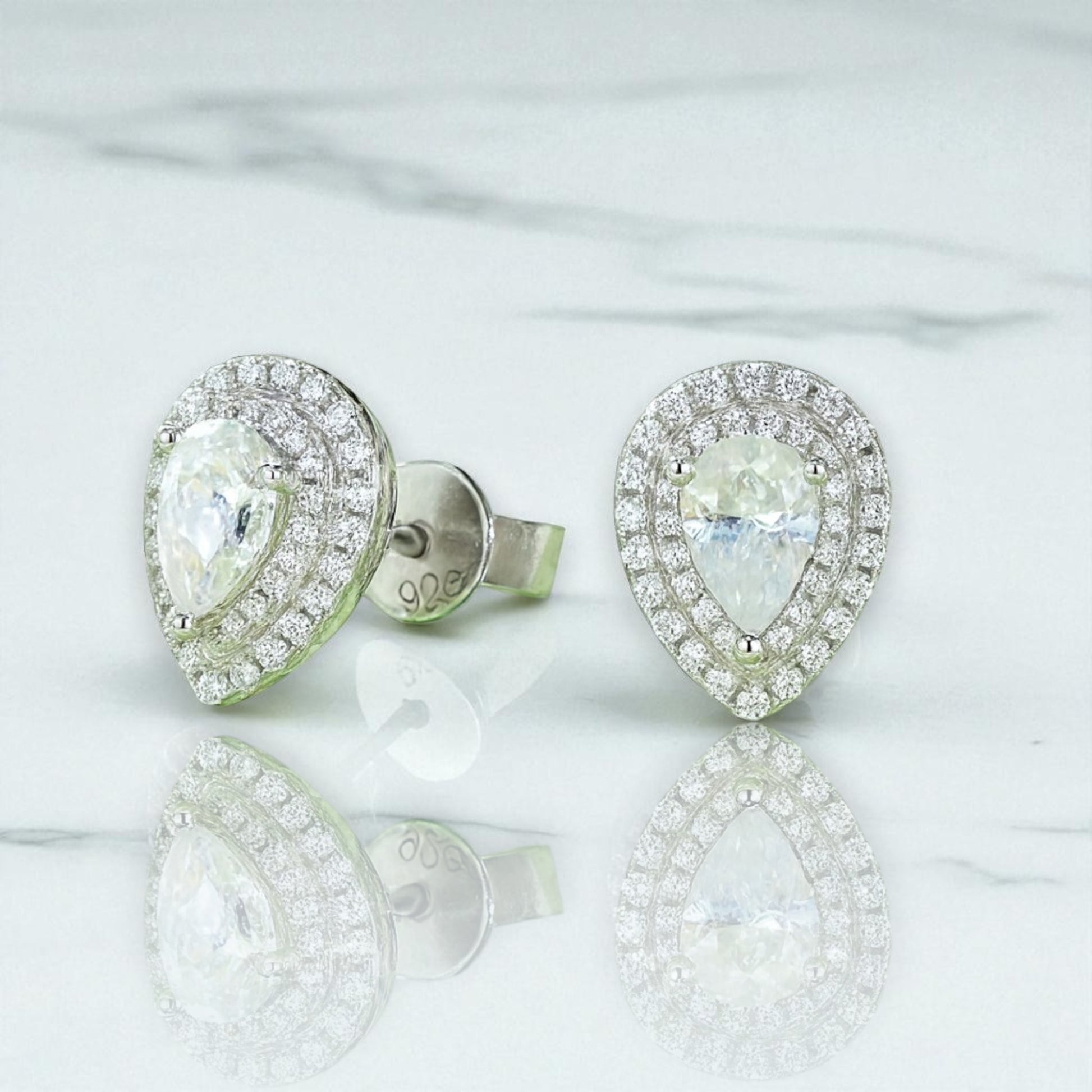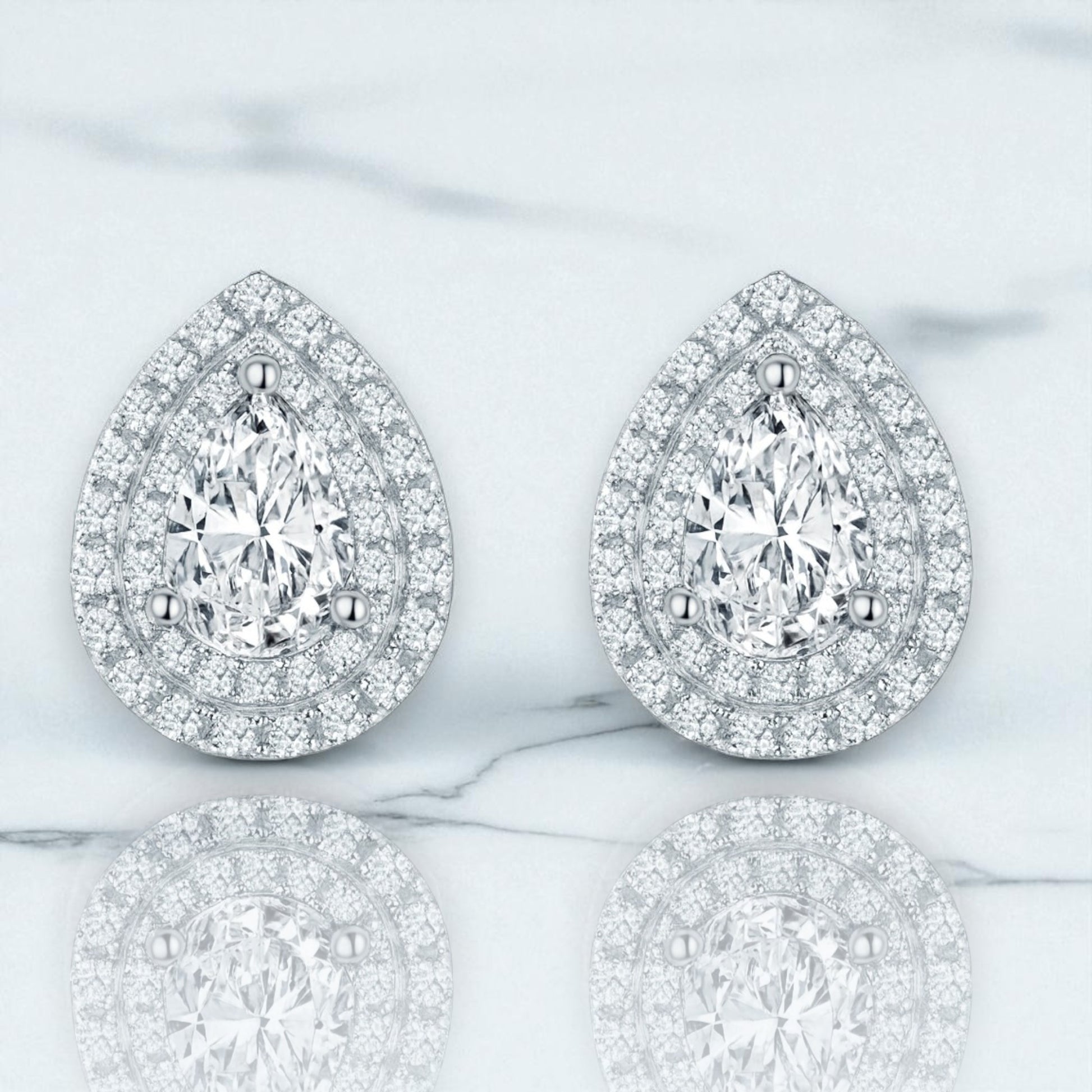 Old world glamour, perfected for every day. A luminous pear-cut center is framed by cascading micro-pavé halos, creating a teardrop of light that feels both romantic and impossibly refined. The low-profile basket sits close to the lobe for effortless wear, while a mirror-bright white-gold finish magnifies the fire of the stones. An heirloom look without the fuss.