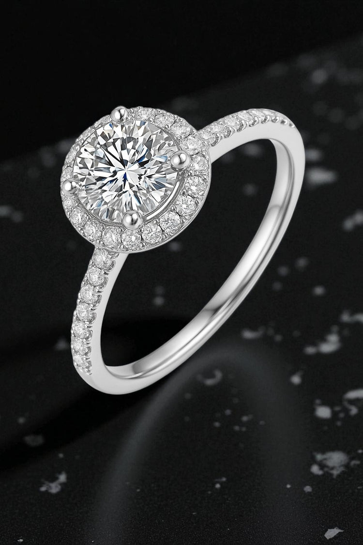 A breathtaking symbol of love, this engagement ring features a brilliant round-cut center stone encircled by a dazzling halo of pavé-set diamonds. The sparkle continues along the slender band, creating a radiant glow from every angle. Crafted in polished white gold, this timeless design balances elegance and modern sophistication perfect for making your forever moment unforgettable.