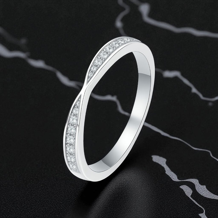 A refined symbol of elegance, this wedding band features a graceful twist design adorned with shimmering pavé-set diamonds. Crafted in polished white gold (or platinum), its subtle curve allows it to pair beautifully with engagement rings or shine on its own. A timeless and versatile piece, perfect for everyday wear or as a meaningful wedding band.