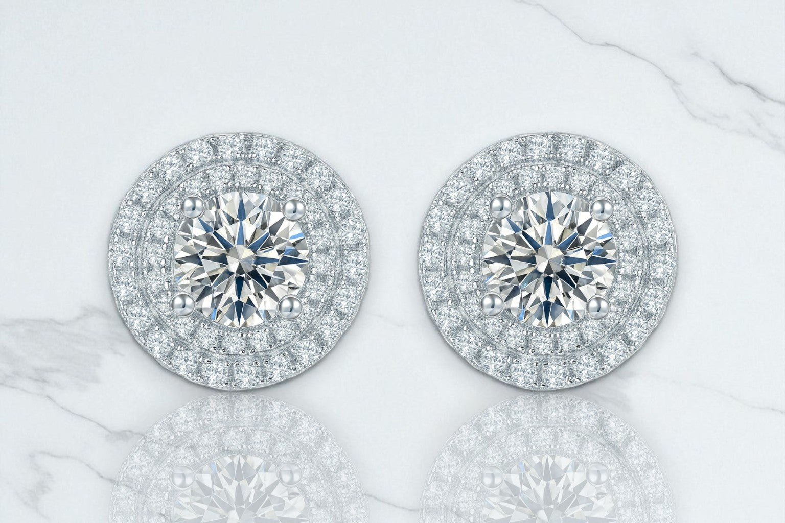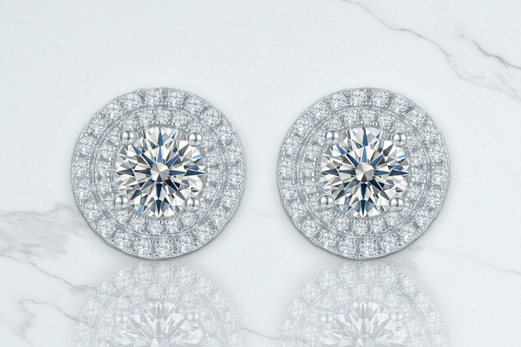 A high jewellery classic reimagined with celestial fire. Each earring features a perfectly cut round brilliant moissanite framed by two concentric pavé halos, creating a luminous dome of light that reads rich from every angle. Refined prongs keep the profile elegant micro-setting delivers a continuous sparkle you can see across the room.
