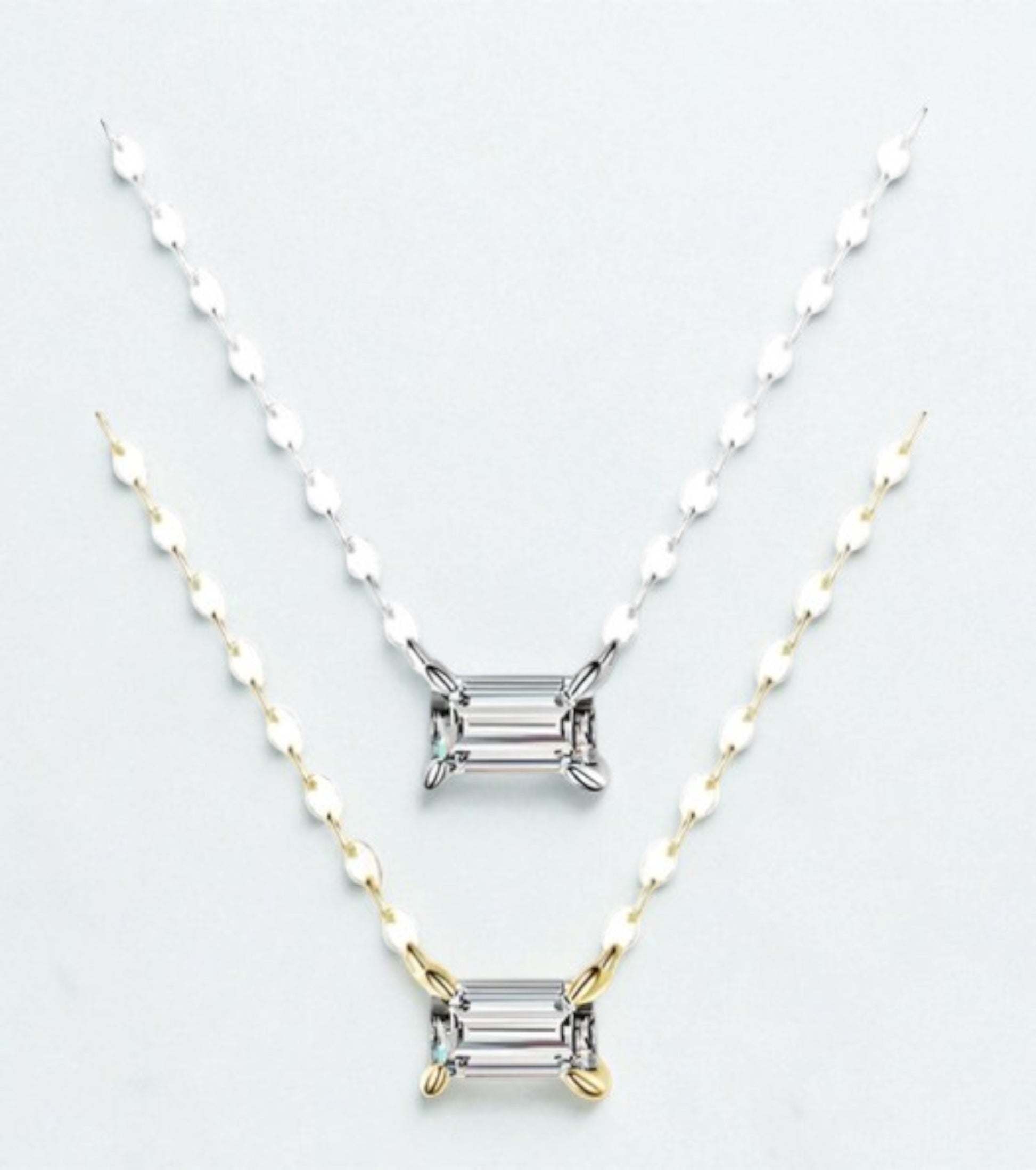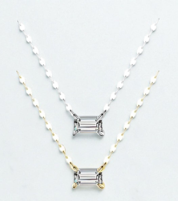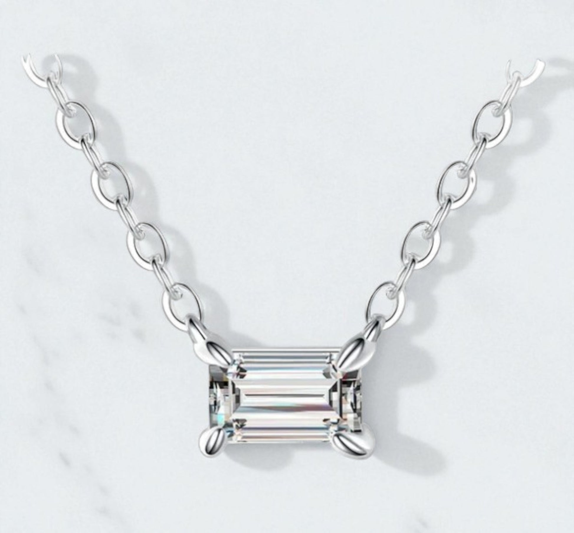 A modern classic with timeless elegance. This emerald-cut solitaire pendant features a precision-cut stone set in a sleek four-prong setting, suspended from a beautifully detailed chain. Available in both silver and gold finishes, it’s the perfect everyday luxury — subtle, refined, and endlessly wearable.