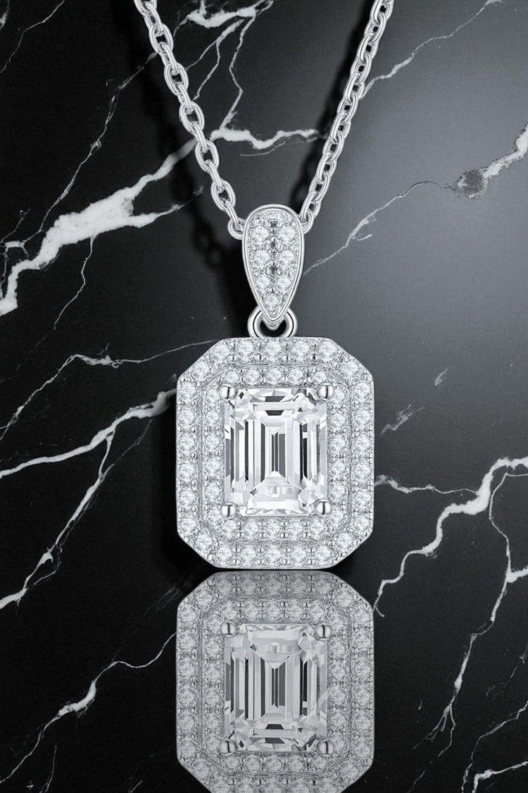 A timeless emblem of elegance, this pendant showcases a striking emerald-cut centerpiece embraced by two rows of brilliant pavé-set diamonds, forming a luminous halo that enhances its captivating depth and fire. Suspended from a diamond adorned bail on a fine chain, this piece embodies sophistication and grace, making it a flawless choice for both everyday luxury and special occasions.