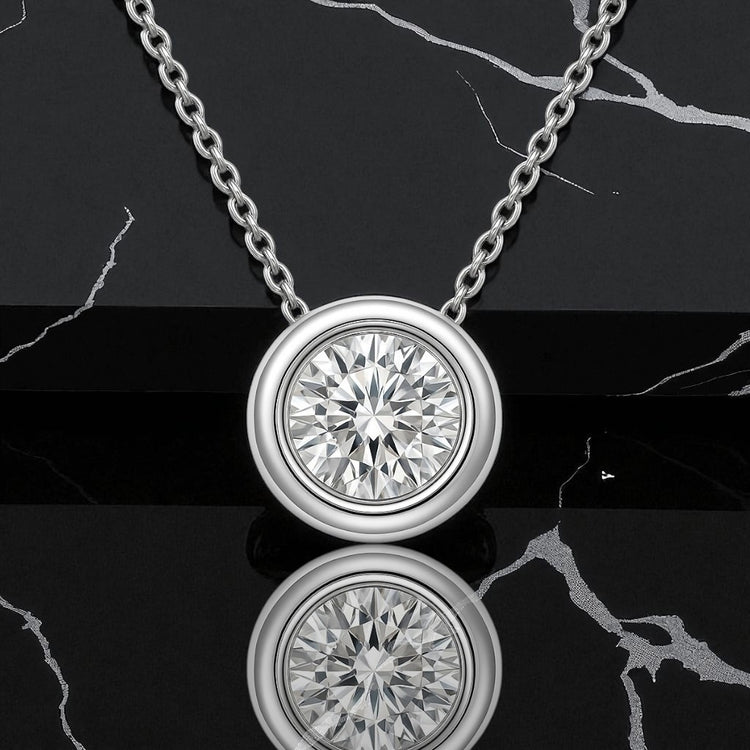 A timeless round brilliant diamond encased in a sleek bezel setting, suspended on a refined chain. Crafted in white gold or platinum, this pendant exudes understated elegance, allowing the diamond’s brilliance to take center stage. Perfect for everyday sophistication or as a modern statement of love.