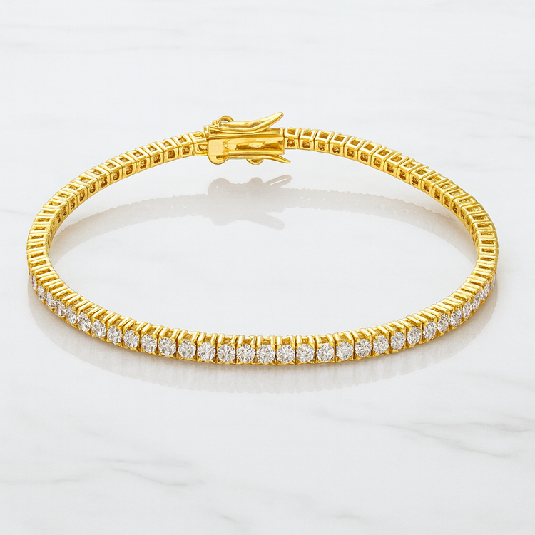 An essential for any jewelry collection, this gold tennis bracelet features a continuous row of brilliant cut moissanite stones delivering diamond-like sparkle with modern elegance. Crafted with precision and secured with a double lock clasp, it’s the perfect blend of everyday luxury and timeless sophistication.