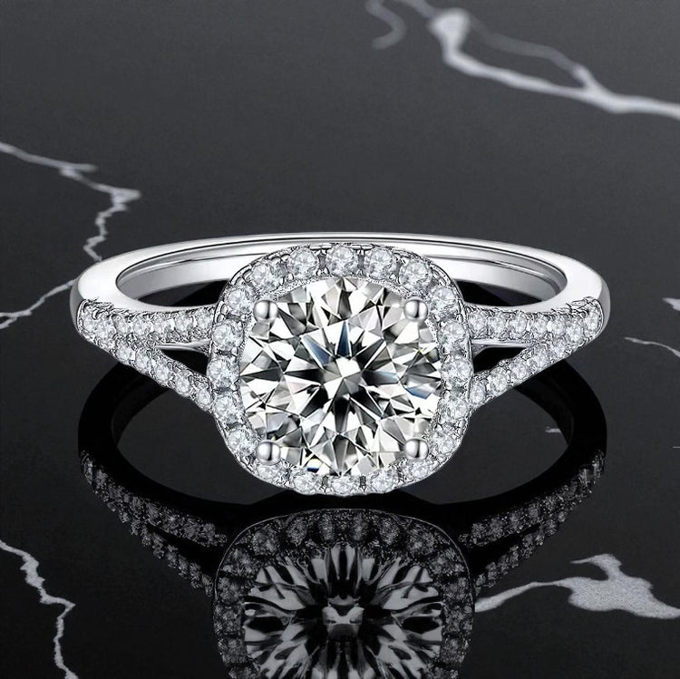 This elegant ring features a brilliant round-cut center stone framed by a shimmering halo of pavé-set diamonds. The split shank design, adorned with additional diamonds, enhances the sparkle and adds a touch of sophistication. Crafted in sterling silver, this timeless piece can also be customized in gold or platinum, making it the perfect choice for engagements or as a luxurious statement ring.