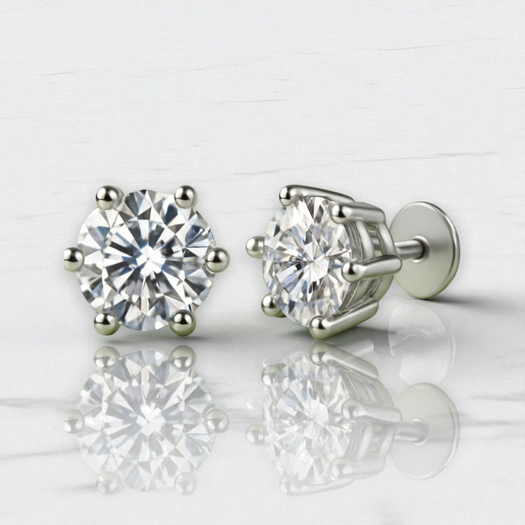 Pure, polished luxury. A pair of precision-cut round brilliant moissanites is cradled in our classic six-prong crown, lifting each stone to catch light from every angle. The basket sits low for day-long comfort while delivering the crisp, diamond-like fire moissanite is loved for. Finished with secure butterfly backs effortless, timeless, and unmistakably premium